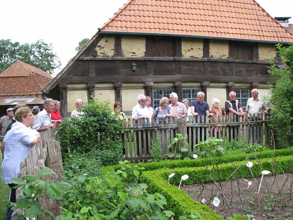 Die Strecke führte uns zu der noch bestehenden 25m hohen Sanddüne mit dem Namen "Hoher Wahn". Hier wird im Winter gern gerodelt. Der Weg verlief zum Ahrenskamp (Maisfeld), die Begegnung mit einem Rudel Wildschweine erfüllte sich nicht, denn es war abgeerntet. Unsere Aufmerksamkeit lenkten wir nun auf ein kleines Moor. In Dunkelheit marschierten wir am Rande des Moores zu einem kleinen Hexenhaus. Der weitere Weg führte uns nun aus dem Wald auf eine befahrbare Straße, über die Bahngleise zum Wienhäuser Kirchweg. Nun ging es wieder zum Ausgangspunkt durch den Wald zurück. Hier überraschte uns Sigrid mit einem reichhaltigen gedeckten Tisch, wir verweilten einige gemütliche Stunden in gemeinsamer Runde.