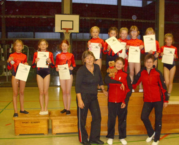Beim "Maskottchenturnier", dem Einsteigerwettkampf für Leistungsturnerinnen im Kreis Celle, erturnten sich die neun gemeldeten Eicklinger Mädchen Anfang November souverän die vorderen Plätze. Alle Turnerinnen beherrschten ihre Übungen an den vier Geräten (Reck, Balken, Boden und Sprung), turnten sicher und konzentriert den Kampfrichtern vor. Für alle neun Eicklingerinnen war es der erste große Wettkampf. Die Jüngsten sind oder werden grad erst sieben Jahre alt! Bei allen von Eicklingen gemeldeten Jahrgängen belegten wir auch die heiß begehrten "Treppchenplätze".