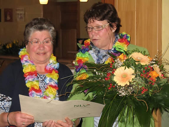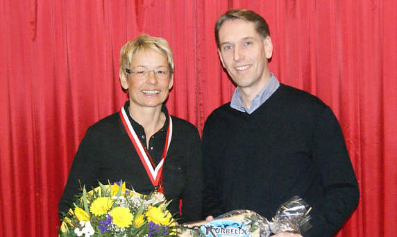 Der Abteilungsleiter Axel Jakob freut sich mit Gudrun Kamp
