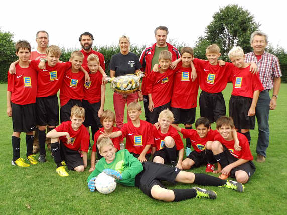 Fortuna machte jetzt mächtig Druck. Doch alle Spieler kämpften um jeden Zentimeter. Arjon hielt immer alles, was auf sein Tor kam. In der 7. Minute machte Arjon den einzigen Fehler im Spiel. Er hat einen Abwurf zum Gegner gespielt, der sofort abzog und das 2:1 erzielen konnte. Danach konnten wir aber dem Druck standhalten und den Sieg einfahren. Die Freude war riesig bei den Spielern. Waren wir doch noch im März, beim Westerceller Hallenturnier, den Fortunen beim 2:0 im Halbfinale völlig unterlegen. Jetzt waren wir Gruppen Erster und spielten um den Turniersieg gegen den Ersten, SV Nienhagen I, der anderen Gruppe. Das Spiel fing für uns sehr gut an. Wir hatten die ersten Chancen, doch Nienhagen wurde immer stärker. Durch zwei Fehler in unseren Spielaufbau lagen wir schnell 2:0 zurück. Doch jetzt versuchten wir alles um das Ergebnis noch positiv von uns zu gestalten. Wir setzten Nienhagen unter Druck. Einen Freistoß von Tim, eine direkt Abnahme von Lenni und einen Schuss von Jeton konnte der Nienhägener Torwart abwehren. Doch gegen das Eigentor, nach scharfer Ecke vom Tim, war auch er machtlos.