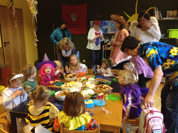 Wieder einmal bewiesen die kleinen Bienen, Feen, Prinzessinnen, Ninja Turtles, Polizisten und Darth Vaders, dass sie auch in Kostümen eine prima Figur machen – und sogar klasse darin tanzen können. Zwischen vielen bunten Luftballons freuten sie sich über Stopptanzen, das Fliegerlied oder den kleinen Bären im Zoo.