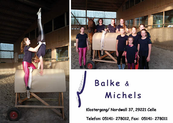 Das in die Jahre gekommene Holzpferd der Eicklinger Voltigierer, mit zerfallender Polsterung und teils eingerissendem Überzug, wurde neu eingekleidet von Balke & Michels. Der Celler Raumausstatter sponsorte eine neue Schaumstoff-Polsterung und einen maßgeschneiderten Kunstlederbezug, angefertig von Auszubildenen und Voltigiererin Gesa Jürgens.