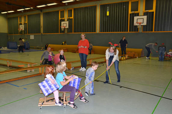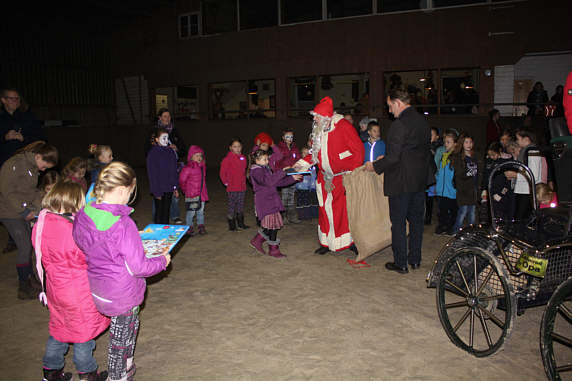 Zum Höhepunkt der Weihnachtsfeier kam der Weihnachtsmann, höchst persönlich, auf der Kutsche in die Halle gefahren. Natürlich hatte der Weihnachtsmann auch für alle Kinder etwas Schönes dabei. Wer konnte sagte ein Gedicht auf, es gab aber für jeden einen Schokoladen-Adventskalender.