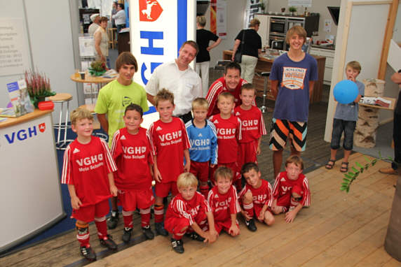 Ein freudiges Ereignis stand trotzdem noch an, das Versicherungsbüro Mario Schmidt aus Eickling hatte sich bereit erklärt, die Nachwuchskicker der U8 mit einen neuen Satz toller Trikots auszustatten. Da das Versicherungsgeschäft der VGH allerdings zu brummen scheint, war ein Termin zur offiziellen Trikotübergabe schwer zu finden. So ergab es sich, dass die Kicker der U8 trotz der schmerzlichen Heimniederlage gegen starke Wienhäuse-ner sich auf in den Ort des Gegners machten. Um den edlen Spender Mario auf der Ge-werbeschau einen Besuch abzustatten und mit ihm die traditionellen Fotos zu schießen. Wie die Orgelpfeifen marschierten wir auf das Zelt und bedankten und vorschriftsmäßig mit einem dreifachen Hipphipp Hurra! Mario lud uns alle noch auf ein Kaltgetränk ein, und versprach uns in unserem letzten Punktspiel am 8.10. um 15.30 Uhr (Terminerin-nerung für Mario) in Bröckel lautstark zu unterstützen (wir sind die Roten mit deiner Werbung!!!).