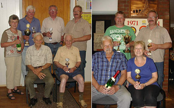 Wie vorhergesagt fing um die Mittagszeit der Regengott an zu weinen, und ein Abbruch der Spiele drohte. Anerkennenderweise zeigten sich die Protagonisten unbeeindruckt regenresistent, spielten mutig weiter und alle Spiele konnten zu Ende gespielt werden. Nach spannenden und teilweise hochklassigen Matches standen die Gewinner fest. Dies waren bei den Damen das Wienhäuser Paar Katrin Regener/Katrin Breuer-Hanebuth vor dem Eicklinger Doppel Renate Hiestermann/Anne Schaumann. Bei den Herren konnten sich Wolfgang Schaumann/Uli Voss gegen die Sieger der letzten zwei Jahre, Thomas Meyer/Johannes Weißenborn, durchsetzen.