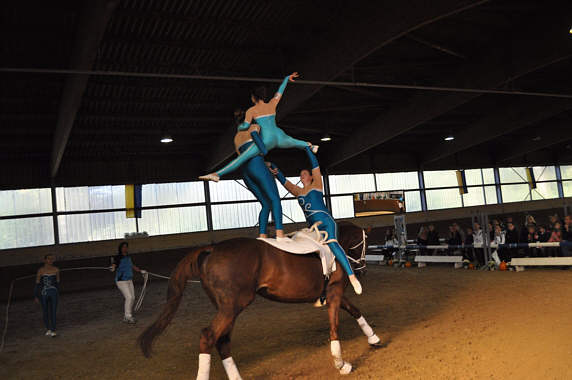 Die nächste Vorführung boten die Voltigierer auf dem Vereinspferd Cali. Die Gruppen Eicklingen 1-3 zeigten Übungen in Schritt und Galopp. Anschließend bewiesen die Springer ihr Können. Die 18 Nachwuchs-Voltigierer auf dem Pferd Wilma turnten unter dem Motto „Zirkus“ in bunten Kostümen. Im Anschluss gab es noch eine Schatten-Licht-Aufführung von Marcella Meinecke und Gesa Jürgens.