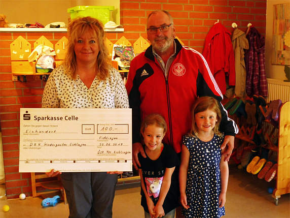 Die Ü50 Mannschaft des TUS Eicklingen spendete der Eicklinger DRK Kita „Rappelkiste“ den Erlös ihres Knobelabends. Die Spende über 100 € wurde vom Ü50-Trainer und Betreuer, Herrn Dietmar Willenberg, persönlich in der Kita überreicht. Die Freude der Kleinen war riesengroß als sie hörten, dass davon Fahrzeuge für das Außengelände des Kindergartens beschafft werden können.