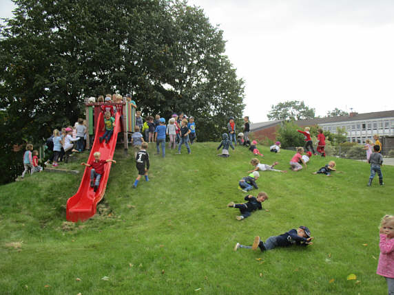 Damit der völlig abgenutzte Berg wieder neu begrünt werden konnte, hatte Herr Saunus, ein Vater aus der Einrichtung, dem Kindergarten bereits im Juni rund 400 Quadratmeter Rollrasen gespendet – und dank der tatkräftigen Unterstützung der Mitarbeiter des Bauhofes Eicklingen, die während der Sommerferien beim Verlegen und Bewässern geholfen hatten, waren die Begrünungsarbeiten ein voller Erfolg.