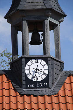 Die mehrjährige Sanierung des Eicklinger Amtsstubenhauses fand jetzt ihren „krönenden“ Abschluss: Oben, im Dachreiter des historischen Gebäudes, hängt wieder eine Glocke. Die aktuelle Tageszeit wird von der gleichzeitig angebrachten neuen Uhr angezeigt. Unter den lateinischen Ziffern I bis XII sieht man den Schriftzug „ren. 2021“ (renoviert 2021). Er bezieht sich auf die mit der Einweihungsfeier im vergangenen Jahr abgeschlossenen Bauarbeiten – kleinere Restarbeiten ausgenommen. Dass nun ausgerechnet die Uhr „unpünktlich“ (statt 2021 erst 2022) ihren Platz eingenommen hat, lag am langwierigen Abstimmungsverfahren mit dem Landesamt für Denkmalpflege. Die Anschlagglocke (d.h. sie schwingt nicht, sondern wird von außen angeschlagen) bleibt noch einige Tage stumm. Die Klang-Premiere findet am 19. Juni um 14.30 Uhr statt, am Tag der offenen Tür des Heimatvereins. Glockenweihe inklusive, dazu Musik von der Big Band, dem Männerchor Eicklingen/Wienhausen, dem Frauensingkreis und den Jagdhornbläsern. Nicht zu vergessen der Auftritt der Volkstanzgruppe sowie Kaffee und Kuchen.